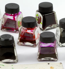 Wasserlösliche Tinten werden auf Wasserbasis hergestellt, sind dünnflüssiger als Tusche, nicht wasserfest, nicht lichtecht und trocken, auch wenn sie farbstark sind, leicht transparent auf. Wir empfehlen die Tinten von Herbin, Jacques Herbin, Faber Castell und Kaweco zum Schreiben mit dem Kolbenfüller aber auch für Kalligrafie
