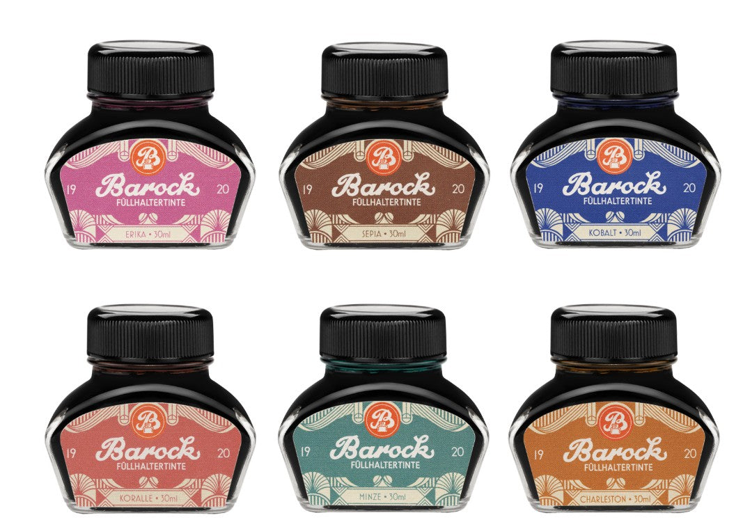Die Barock 1920 Tinten-Kollektion entführt Sie in die schillernde Welt der Goldenen Zwanziger - eine Zeit des Aufbruchs, der Eleganz und der künstlerischen Revolution. In dieser Ära erwachte das Schreiben zu neuer Blüte, und jeder Federstrich erzählte Geschichten von Hoffnung, Leidenschaft und Innovation.