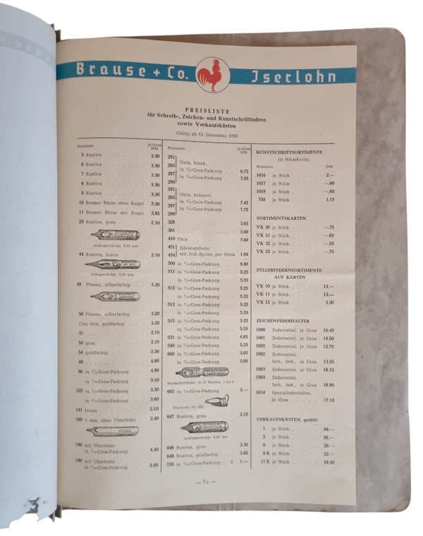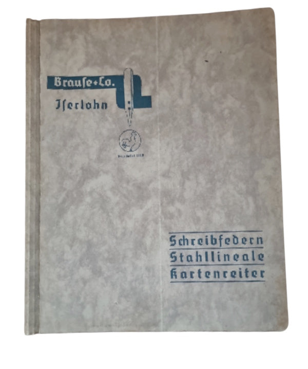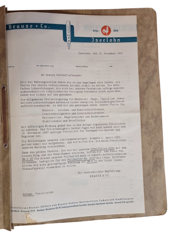 Alte Verkaufsmappe von Brause + Co. Iserlohn mit Anschreiben, Preislisten, Bestellkarte und Prospekt zu Füllern aus dem Jahr 1950.
