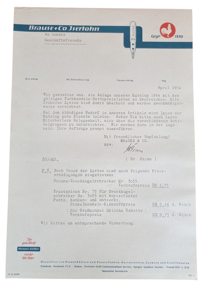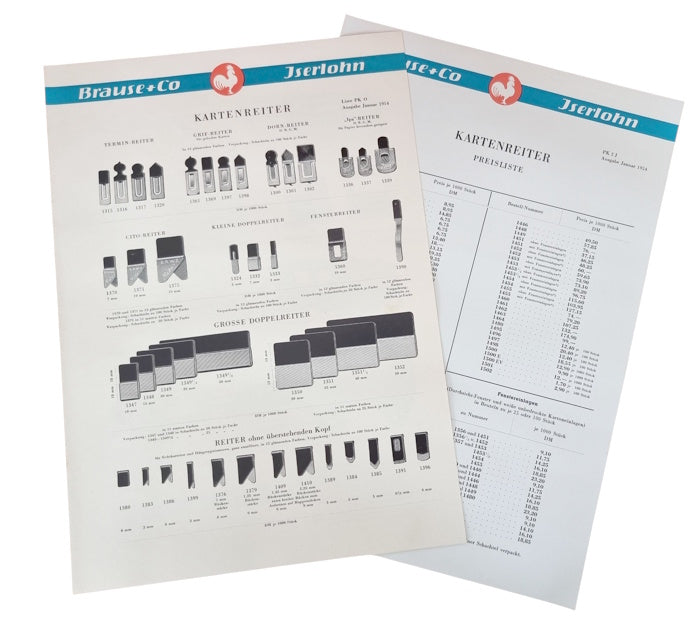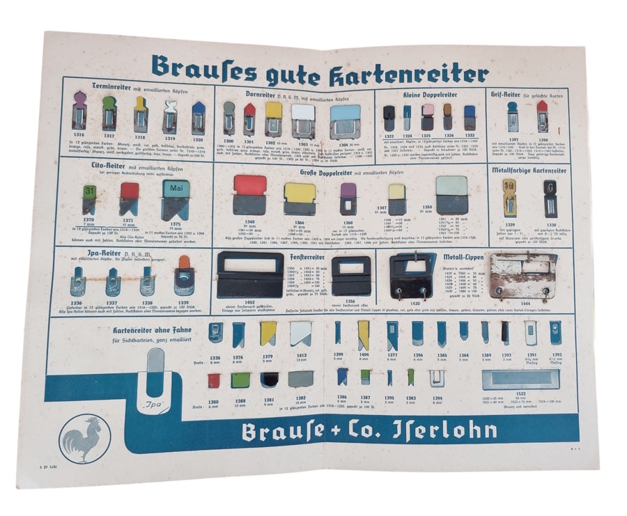 Alte Verkaufsmappe von Brause + Co. Iserlohn mit Anschreiben, Preislisten und Musterbogen mit Kartenreitern aus dem Jahr 1954.