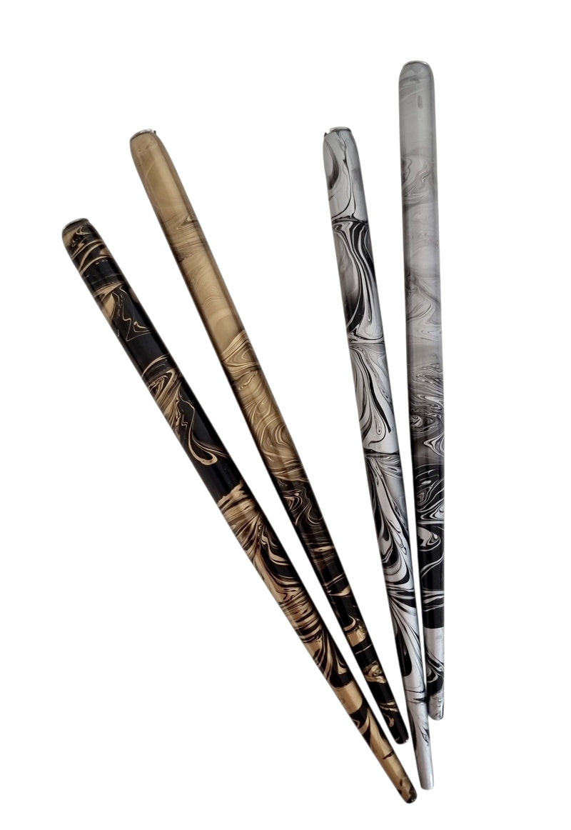 Federhalter in hochglänzender Lackierung gold-schwarz oder silber-schwarz. Jeder Federhalter ist anders in der Marmorierung und wird so zu einem Unikat. Der innenliegende traditionelle Einsatz für die Feder ist aus Metall und passend für alle herkömmlichen Schreibfedern.