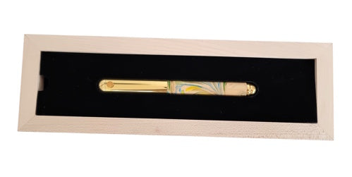 Ein Füllfederhalter der Extraklasse - Goldglänzendes Messing in vollendeter Harmonie mit marmoriertem Ahorn und einer vergoldeten Schreibfeder der Stärke M von SCHMIDT® Füllhaltertechnik - hier entstehen seit Jahrzehnten Komplett-Füllhaltermodule allererster Güte für die großen Marken der Welt. Die Kappe aus Messing ziert eine Rollbremse, welche nicht nur das Wegrollen verhindert, sondern dem Füller auch einen ganz besonderen Eyecatcher gibt. Sowohl mit Konverter als auch mit Patrone nutzbar. Ein Konverter liegt bei. Das Design des Füllhalters ist von Buero Harborth. Füller und Konverter liegen wahlweise in einem gefütterten Holzetui aus Bergahorn, welches auch als Schale für Schreibgeräte genutzt werden kann oder in einem schwarzen Etui aus Kunstleder, welches weich gepolstert ist.