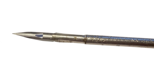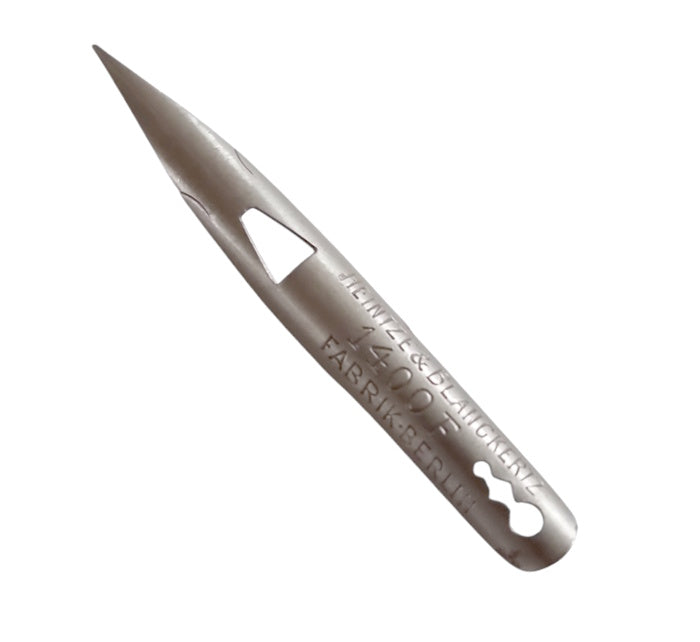 Alter Graphitminen- und Federhalter aus versilbertem Alublech. Der Halter trägt die Gravur HEINTZE & BLANCKERTZ FABRIK-BERLIN und Verzierungen. Auf einer Seite steckt eine unbenutzte Grahitmine, auf der anderen eine sehr flexible Spitzfeder Heintze & Blanckertz 1400 F, welche austauschbar ist. Dazu gibt es eine Schutzkappe. Der Zustand ist altersgemäß gut, weist kleinere Roststellen auf.