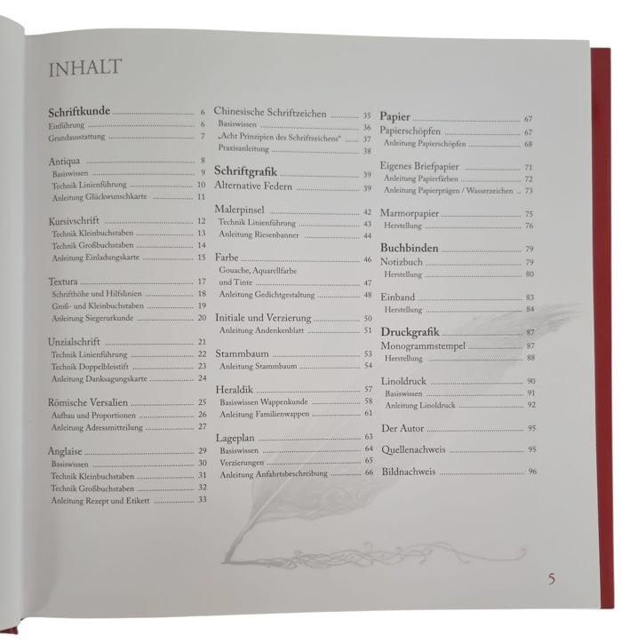 Im Stil der alten Meister - Dieser Bildband führt Sie Schritt für Schritt in die Kunst des schönen Schreibens. Erstellen Sie Einladungen, Grußkarten, Briefe und Dokumente, Wappen und Stammbäume im Stil der alten Meister. Lassen Sie sich mitreißen von der Faszination für Feder, Tinte und Papier. Alles wesentliche zur Kunst der Kalligraphie wird mit zahlreichen fachgerechten Illustrationen und Fotos einfach erklärt: Schriftarten, Schmuckbuchstaben, Farbwirkungen, Schreibfedern. Dieses Buch enthält Extra-Kapitel zur Herstellung von Briefpapier und geprägtem Büttenpapier, zur Fertigung eines Notizbuches und zur Schaffung neuer Bucheinbände. Fertigen Sie Ihre eigenen Werke als Unikate.