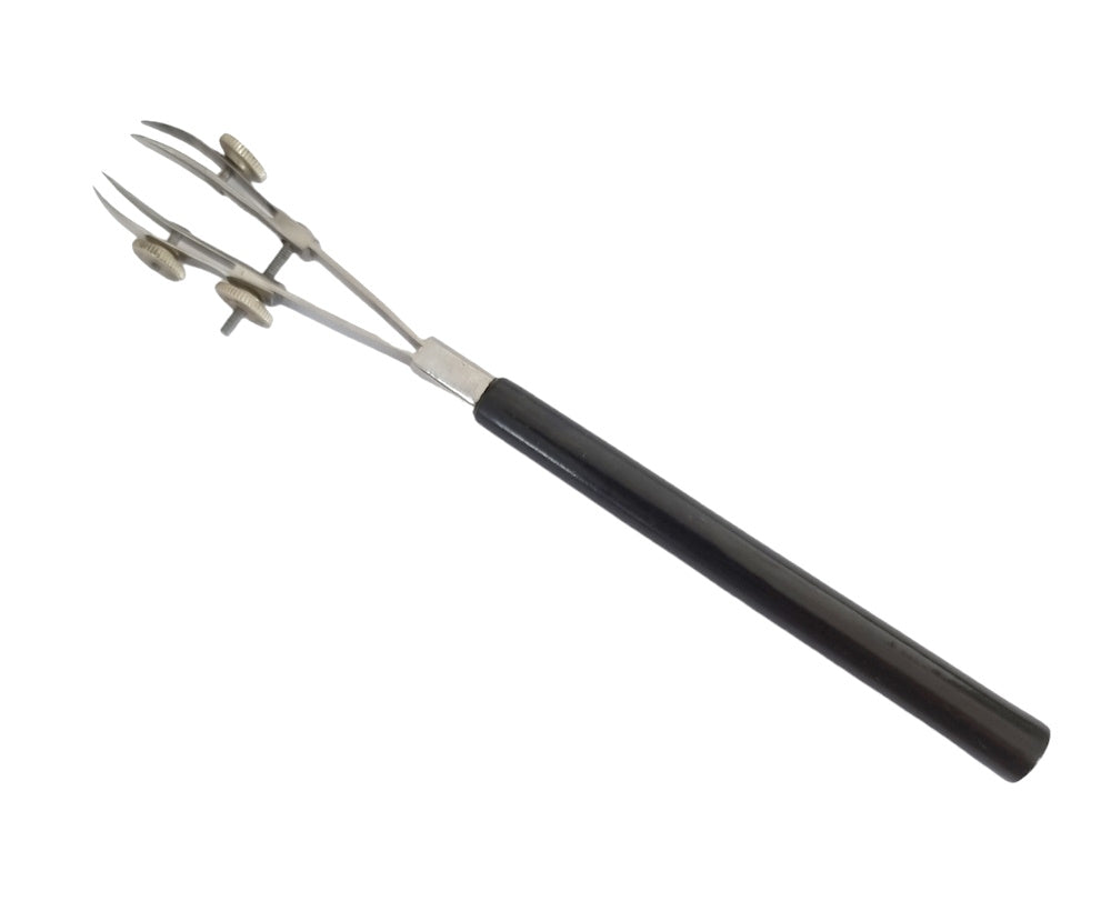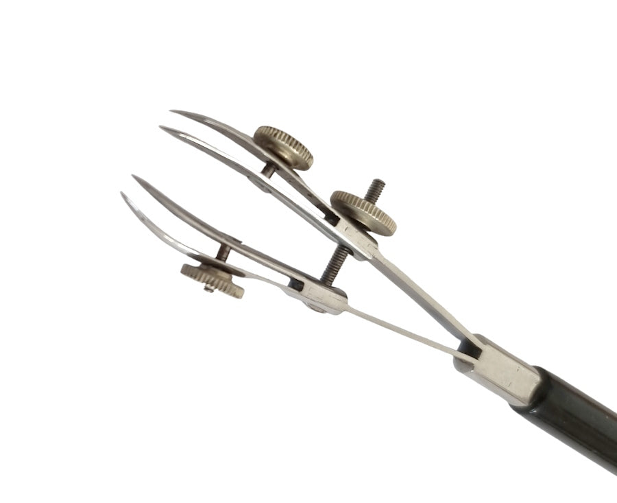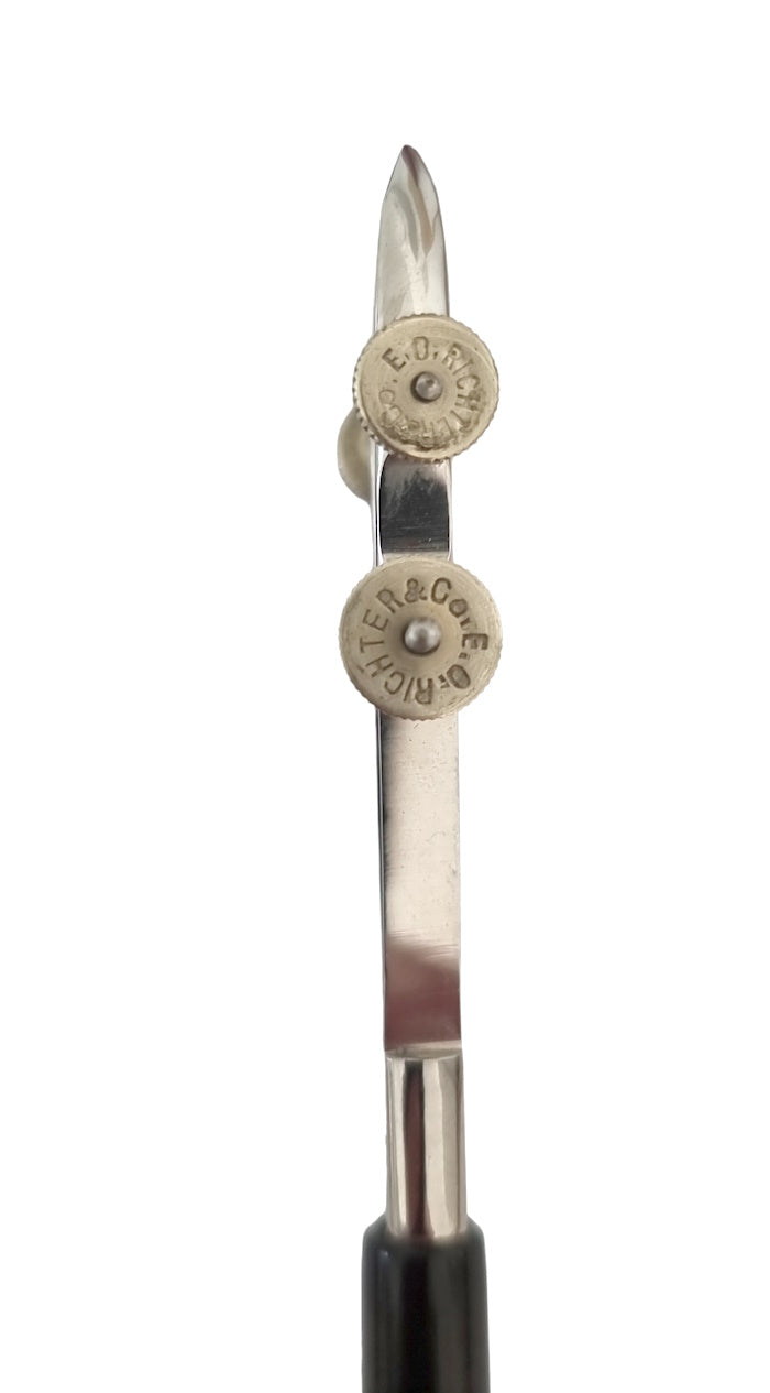 Katasterfedern wurden in der Topografie eingesetzt. Diese Topographenfeder besteht aus zwei Edelstahlfedern mit je zwei Metallzungen. Jede hat eine Stellschraube. Mit einer dritten Stellschraube verstellen Sie den Abstand der beiden Edelstahlfedern zueinander. Der Griff der Handreißfeder ist aus schwarz lackiertem Holz mit einem innenliegenden Metallgewinde für die Feder. Die Feder kann ausgewechselt werden indem man sie abschraubt.