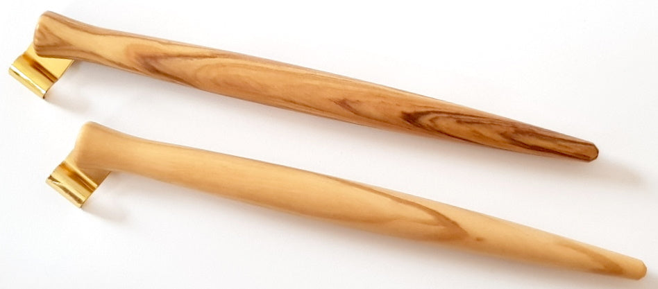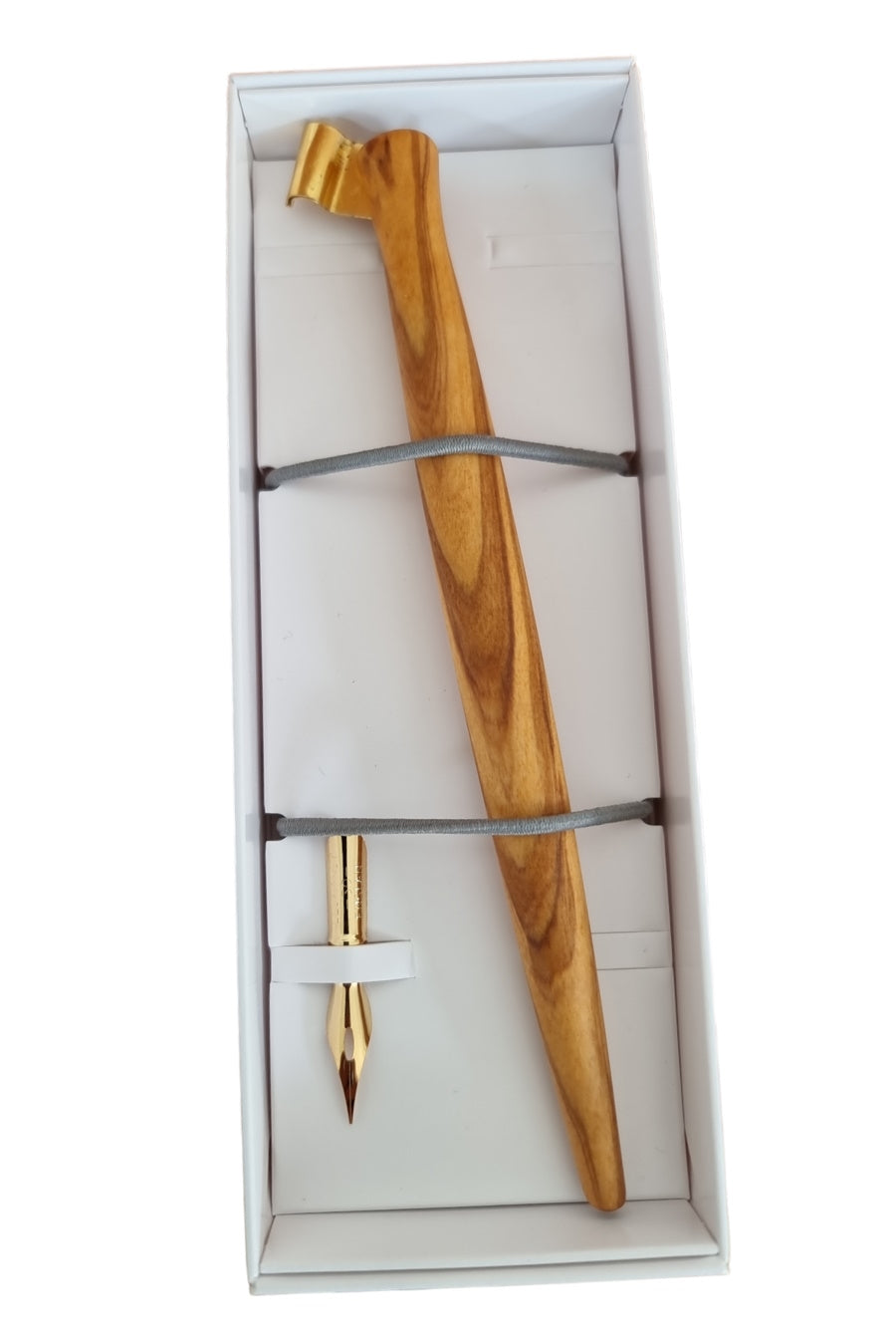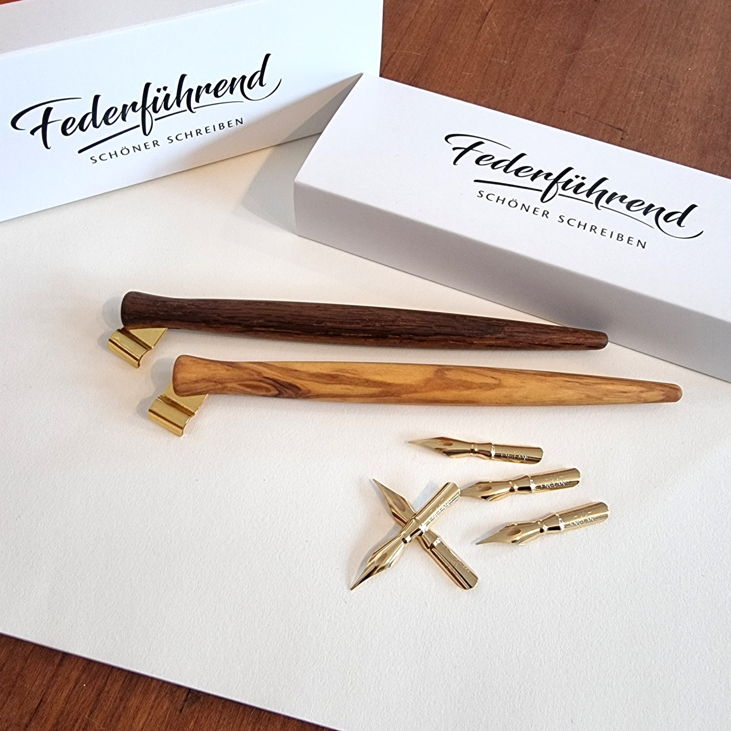 Unseren Oblique Federhalter CURVE aus hochwertigem Olivenholz lassen wir in einer Drechslerei in Bayern fertigen. Der Flansch ist aus Messing in gold und lässt sich bei Bedarf auswechseln. Es liegt eine Schreibfeder bei - wechselnde Modelle. Der Oblique Penholder ist ideal, wenn Sie Englische Schreibschrift Copperplate oder andere Schreibschriften schreiben möchten, da durch den abgewinkelten Flansch der korrekte Schreibwinkel erreicht wird. Wir präsentieren das Set in einer edlen weißen Box mit Schuber, welcher unser Logo trägt. Auch ein wunderschönes Geschenk für alle Freunde der Schriftkunst.