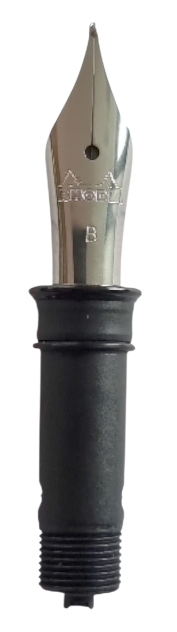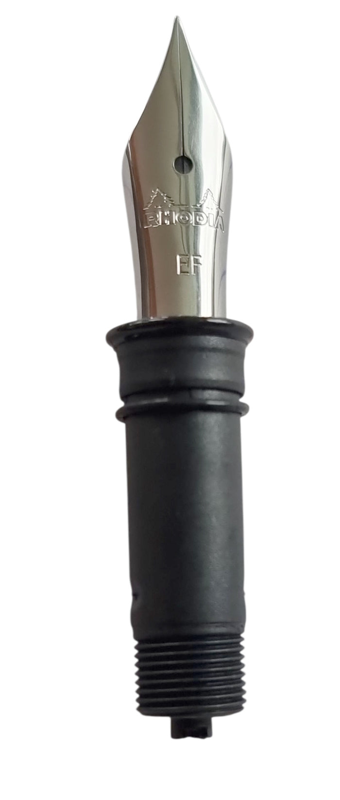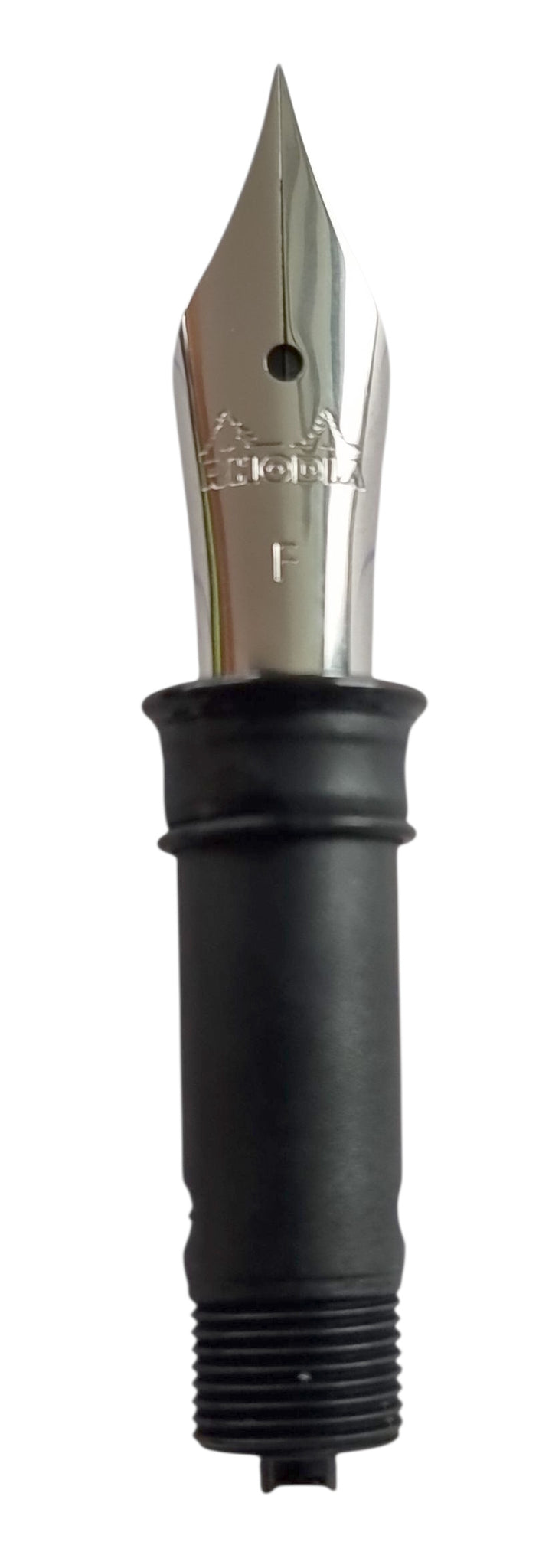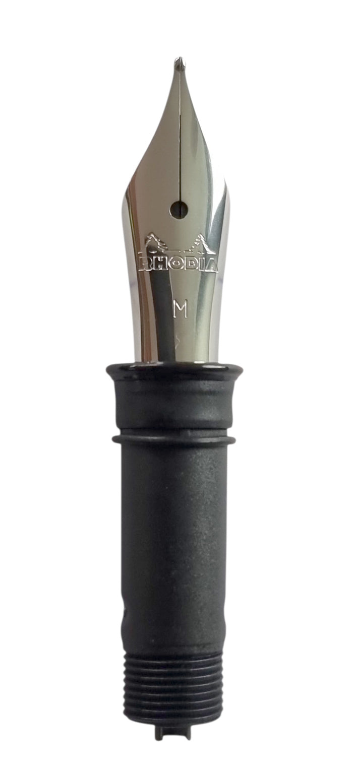 Schreibfeder inkl. Tintenleitersystem von Rhodia mit Iridiumfeder. Die Federspitze ist ein Point Pen in der Stärke EF, F, M oder B. Die Feder trägt die Gravur >Rhodia< plus die jeweilige Stärke. Der Füllhaltereinsatz ist aus schwarzem Kunststoff zum Einschrauben in das Griffstück. Passend für den Rhodia Script Hexagon.