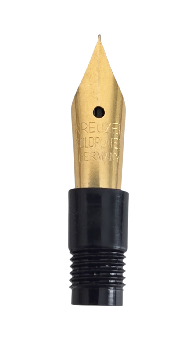 Alte Schreibfeder inkl. Tintenleitersystem von KREUZER mit vergoldeter Edelstahlfeder F. Die Feder trägt die Gravur KREUZER Goldplated Germany. Der Füllhaltereinsatz ist aus schwarzem Kunststoff zum Einschrauben in das Griffstück.