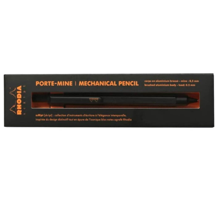 Hochwertiger Druckbleistift aus gebürstetem Aluminium in schwarz. Der Bleistift hat eine hexagone -sechseckige- Form und trägt einen kleinen Radiergummi unter dem Druckknopf. Der Clip trägt das Rhodia Logo in orange.