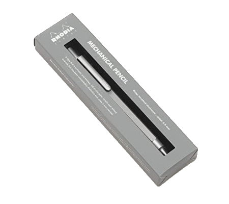 Hochwertiger Druckbleistift aus gebürstetem Aluminium in silber. Der Bleistift hat eine hexagone -sechseckige- Form und trägt einen kleinen Radiergummi unter dem Druckknopf. Der Clip trägt das Rhodia Logo in weiß